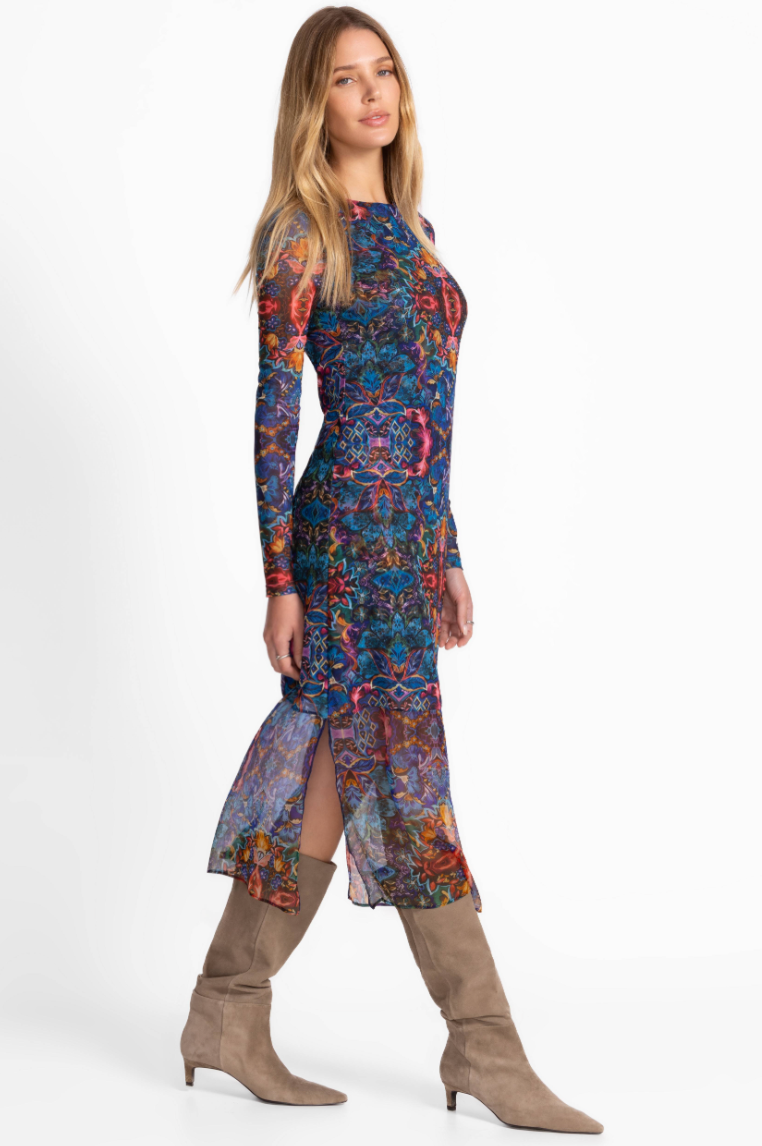Embellished with a bold kaleidoscope of color and pattern, the Tulus Mesh Midi Dress is crafted from a lightweight, breathable fabric. Featuring a boat neckline and long sleeves, this partially lined dress is finished with a midi skirt and side slits. Pair with riding boots and a coordinating clutch for a modern evening look.