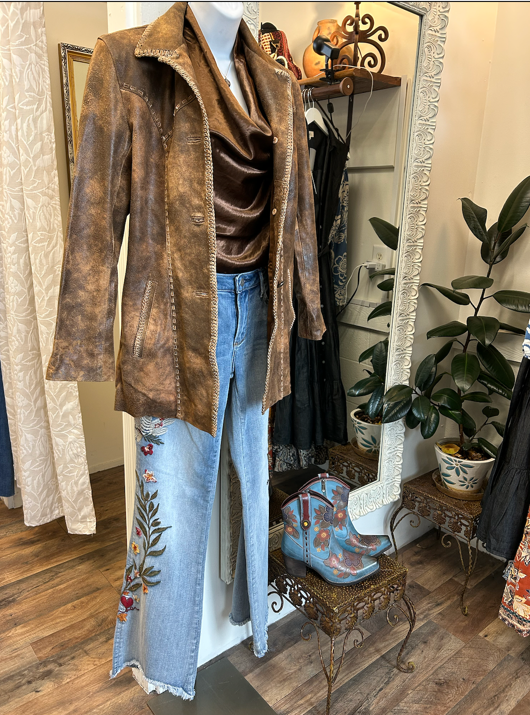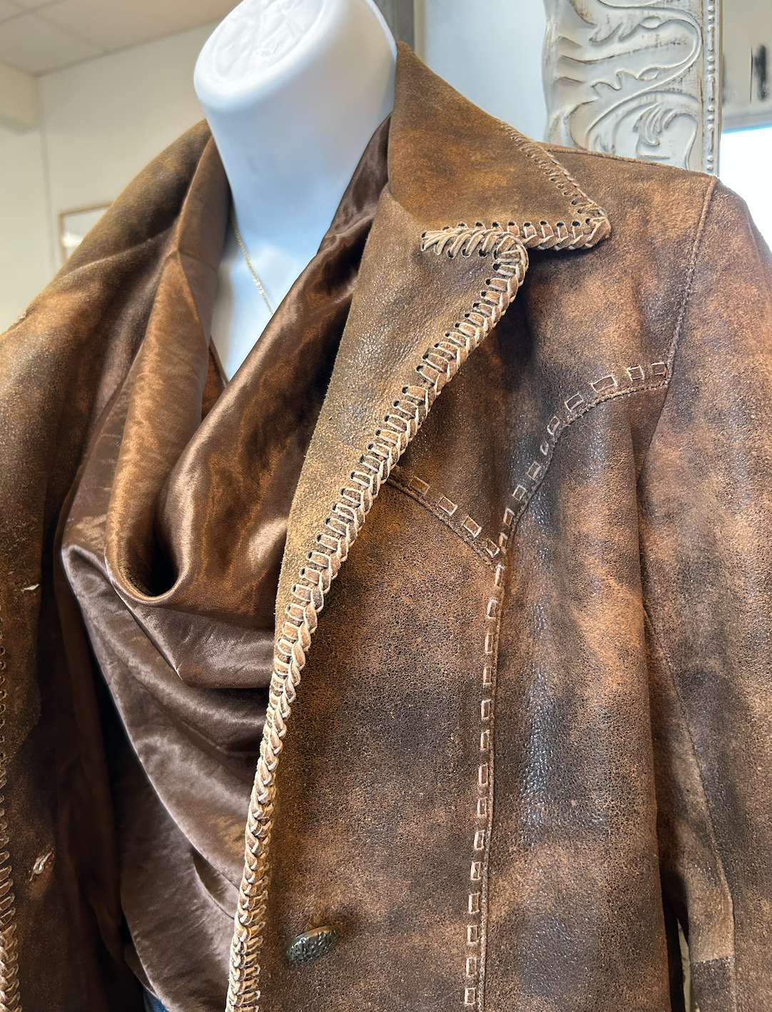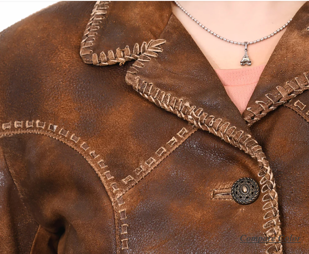 Elevate your Western wardrobe with timeless sophistication in this Women's distressed brown leather blazer. Crafted from rich, vintage-finished leather, this jacket features decorative whipstitching along the seams, collar, and pockets for a handcrafted touch. The tailored design contours the body beautifully, offering a comfortable fit without sacrificing that rugged cowgirl charm. Finished with rustic concho-style buttons and front hand pockets, it's the perfect combination of elegance and edge. Runs small, order one size up.