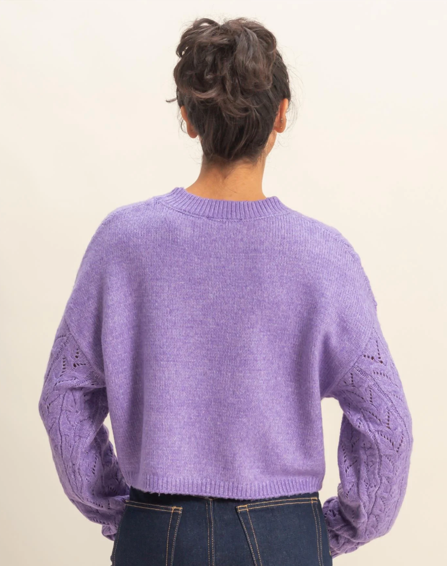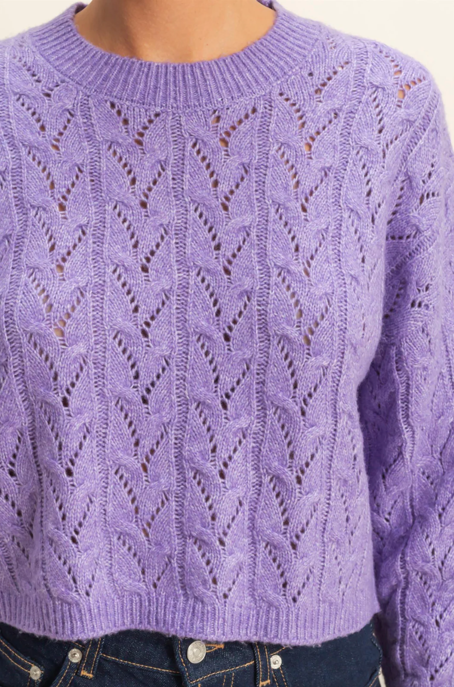 This cozy, cable knit sweater, features an elegant leaf-like pattern that adds a touch of nature-inspired beauty. The relaxed fit ensures comfort while offering a flattering silhouette, making it perfect for a casual day out or a cozy evening indoors.