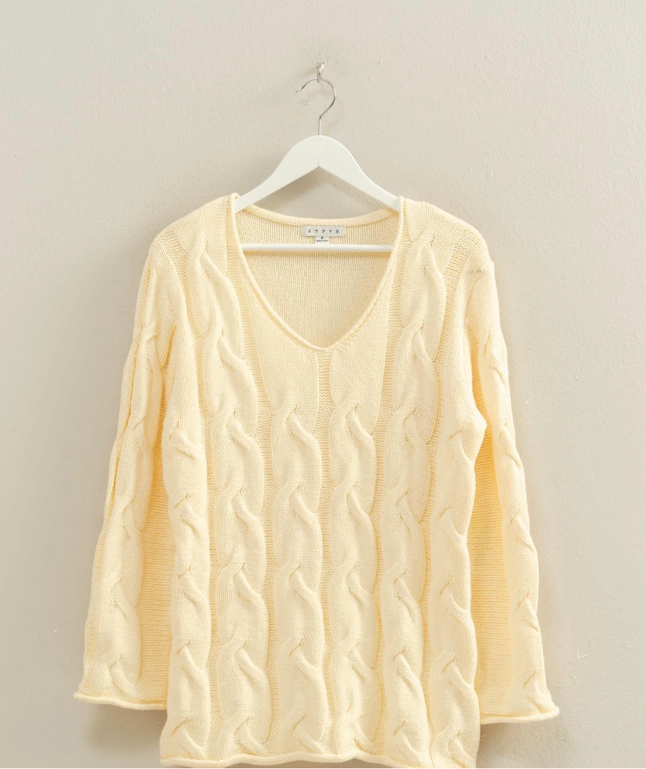 This timeless pullover sweater, features an intricate cable knit design and cozy V-neck. Ideal for versatile styling, layer it over crisp shirts for a polished look or pair it with denims for a casual outing.60% Cotton 40% Acrylic