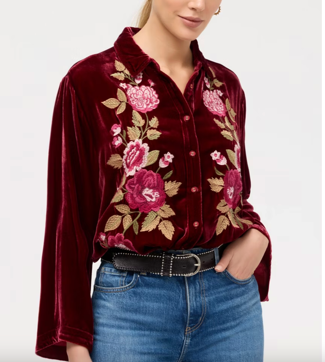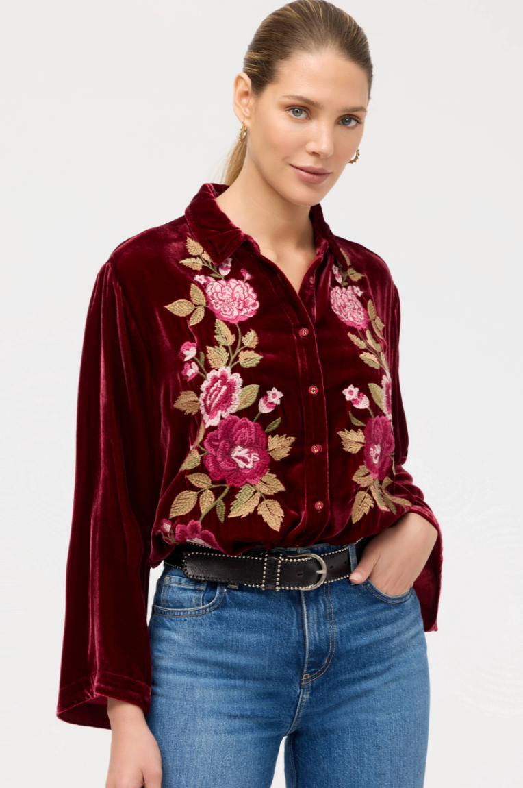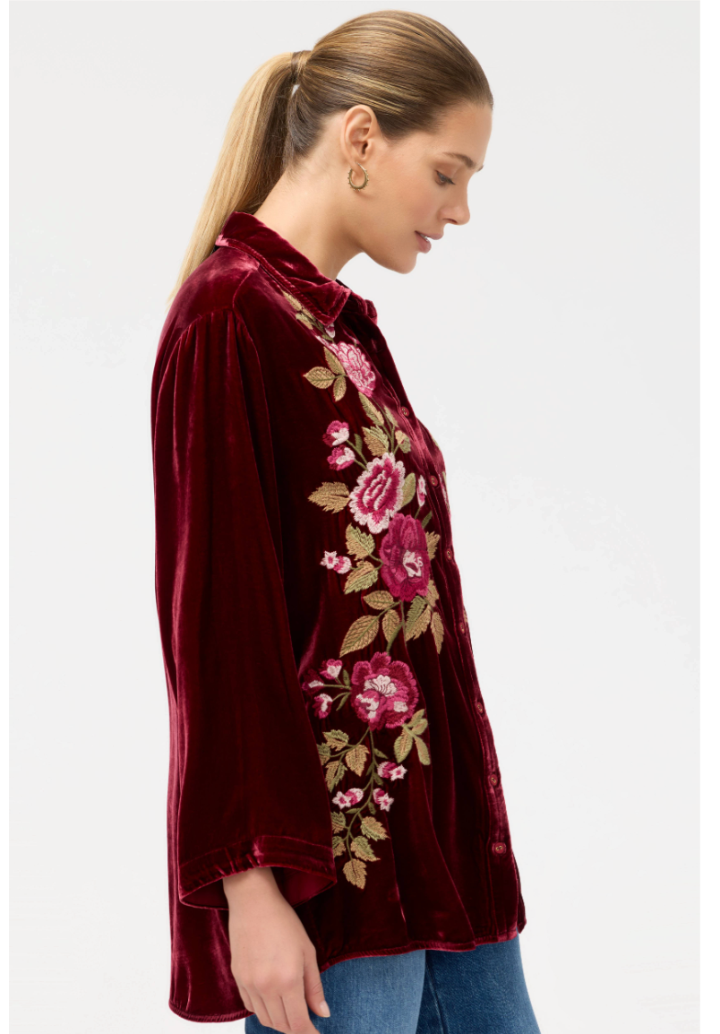 The Kimono Sleeve Shirt offers a fresh take on a classic button-down with intricately placed embroidered florals for a burst of color. Crafted from a unique silk blend, this collared shirt features wide kimono-style sleeves and is finished with a gently curved hemline. Pair with colorful trousers and black flats for a polished eye-catching ensemble.